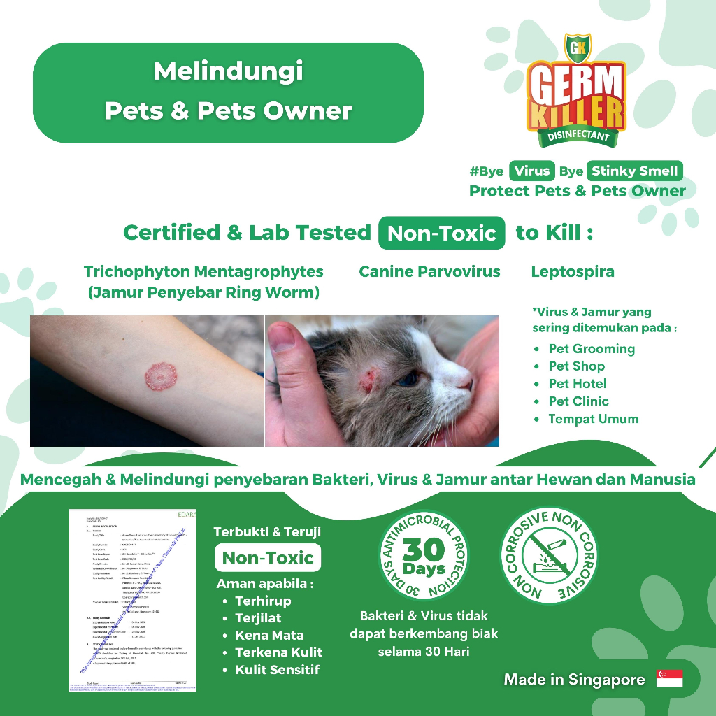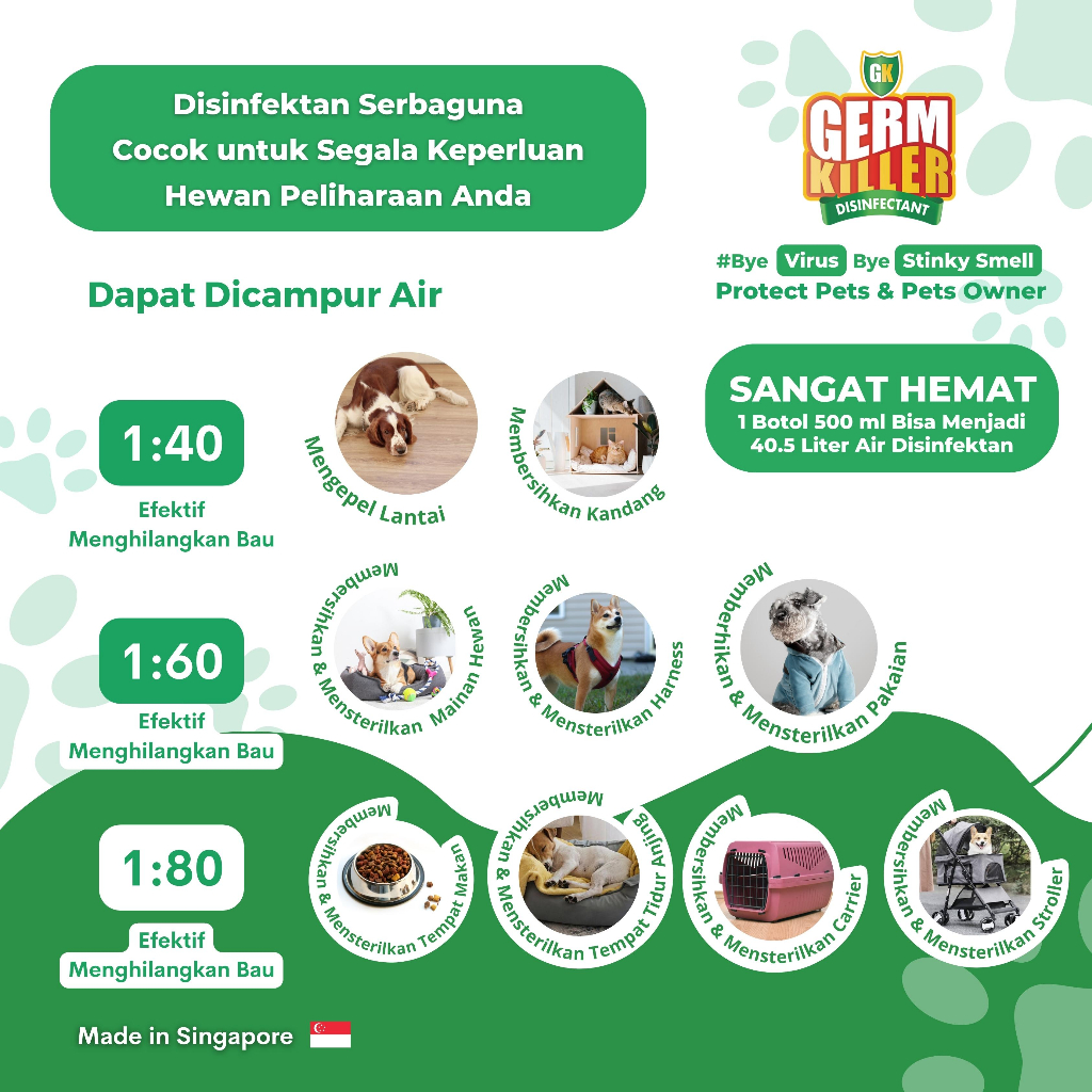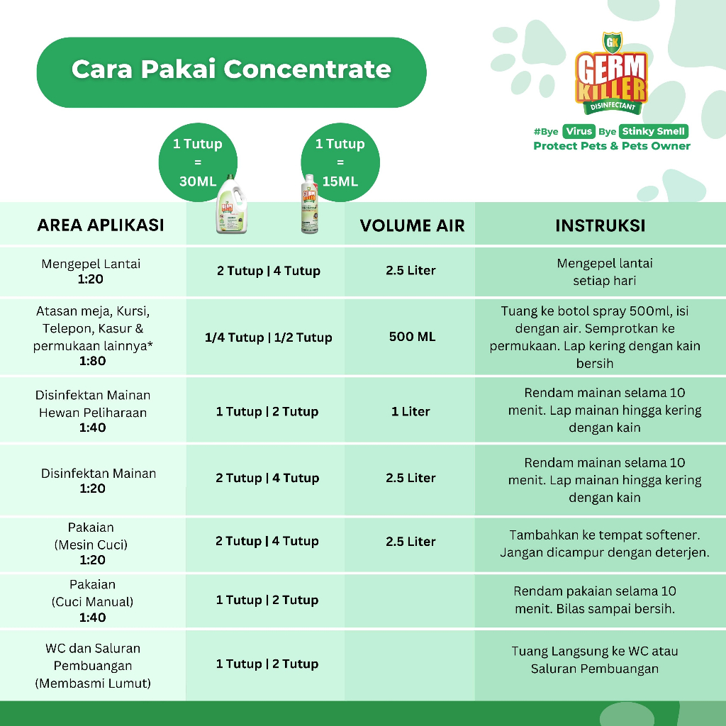 • Untuk mainan / alat keperluan hewan peliharaan anda bisa campurkan 30 ml GK Concentrate dan 1 Liter Air namun rendam dulu mainan / alat keperluannya selama 10 menit agar seluruh bakteri dan virus bisa terangkat kemudian lap bersih dan keringkan
