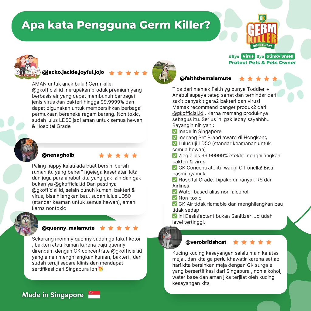 Campuran GK Concentrate bisa mencegah bakteri dan virus selama 24 jam, dan mehilangkan bakteri dan jamur penyebab bau. Selain itu, untuk GK Concentrate dilengkapi juga dengan natural citronella sehingga bisa menjauhkan nyamuk/serangga lainnya dari ruangan / benda-benda yang sudah di cuci dengan GK concentrate.